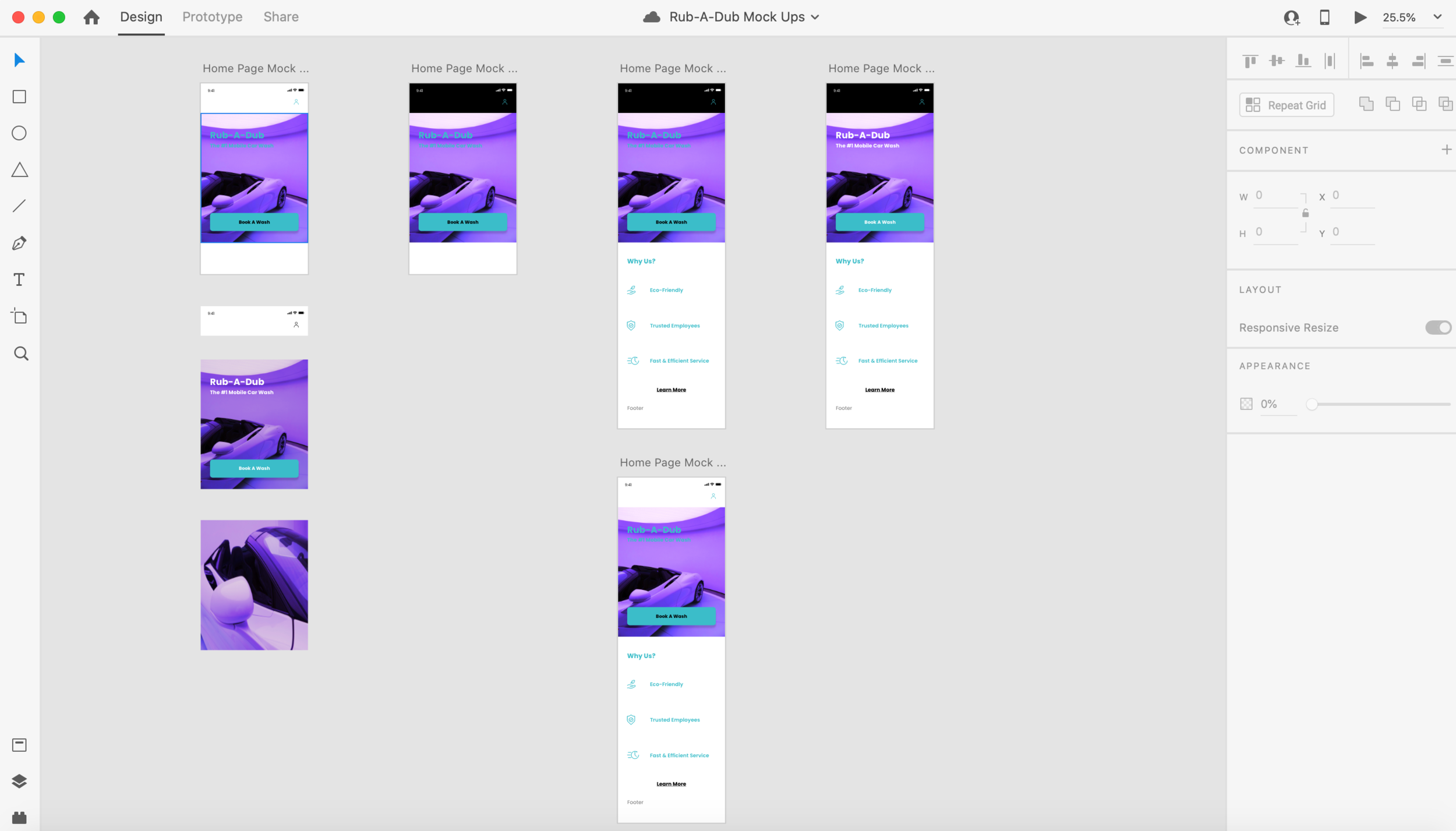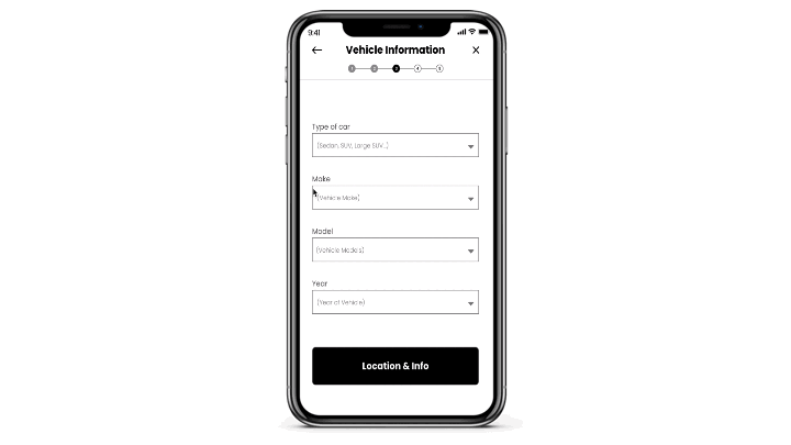 From the homepage, users clicked the primary CTA “Book a Wash” which navigates them to the category and PDP pages. We included a progress bar, back and close buttons to keep our users confident and in control when navigating through the wizard. We also included 24x24px radio buttons and ensured that each element had a 44x44px tappable area, which follows best practice for app design.