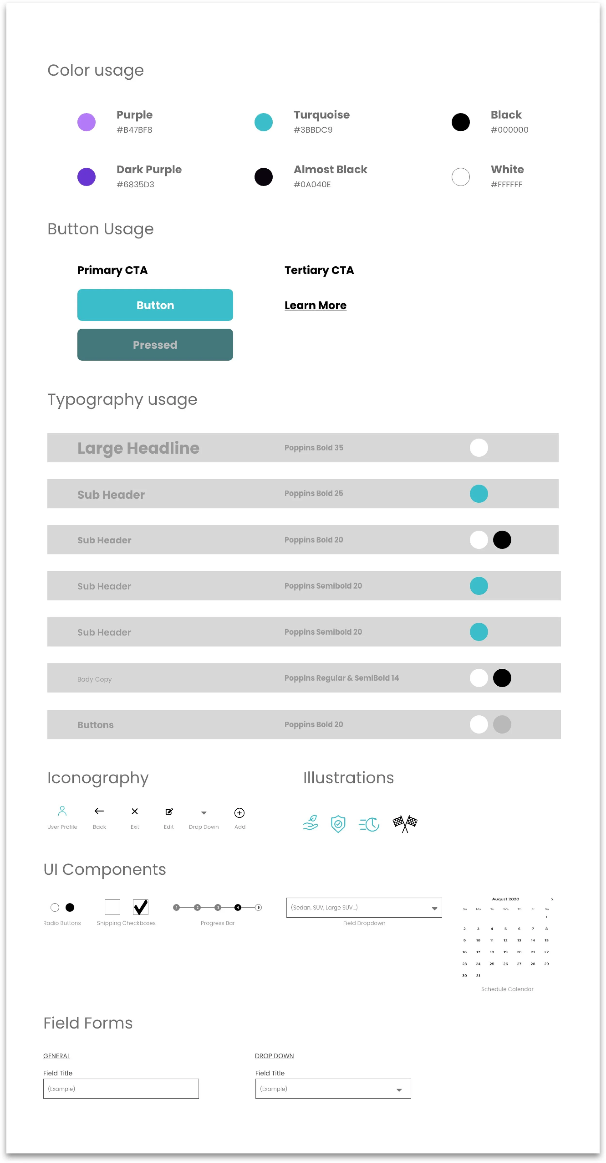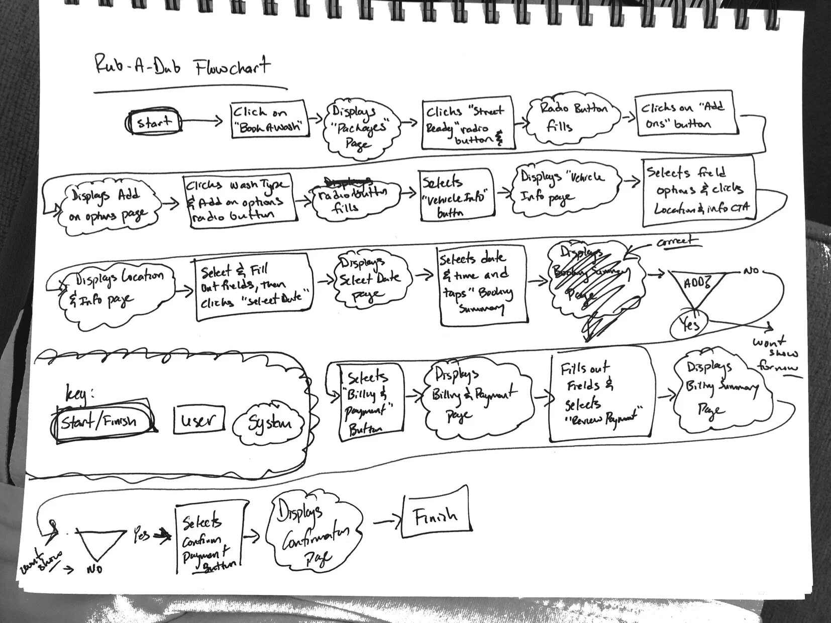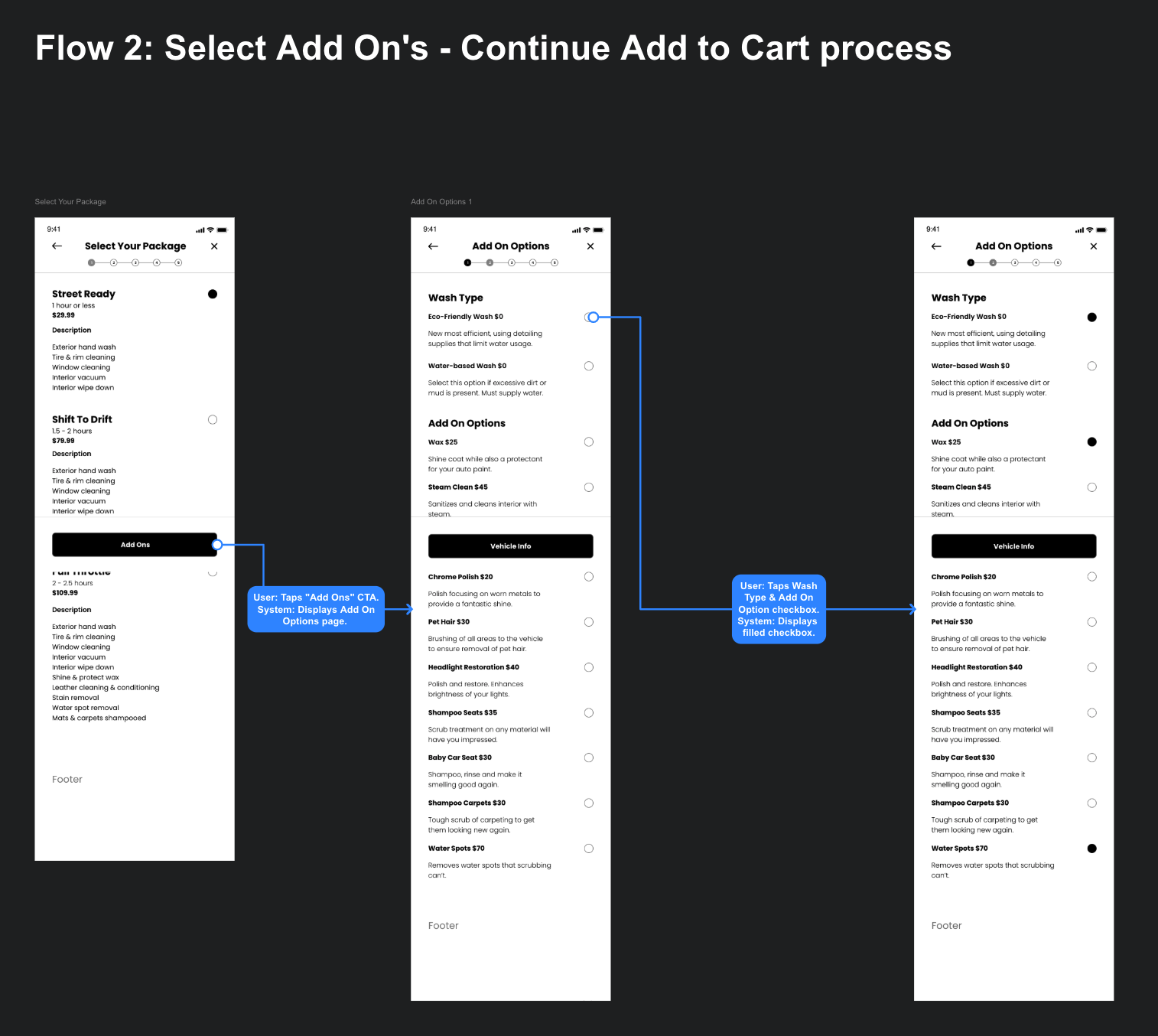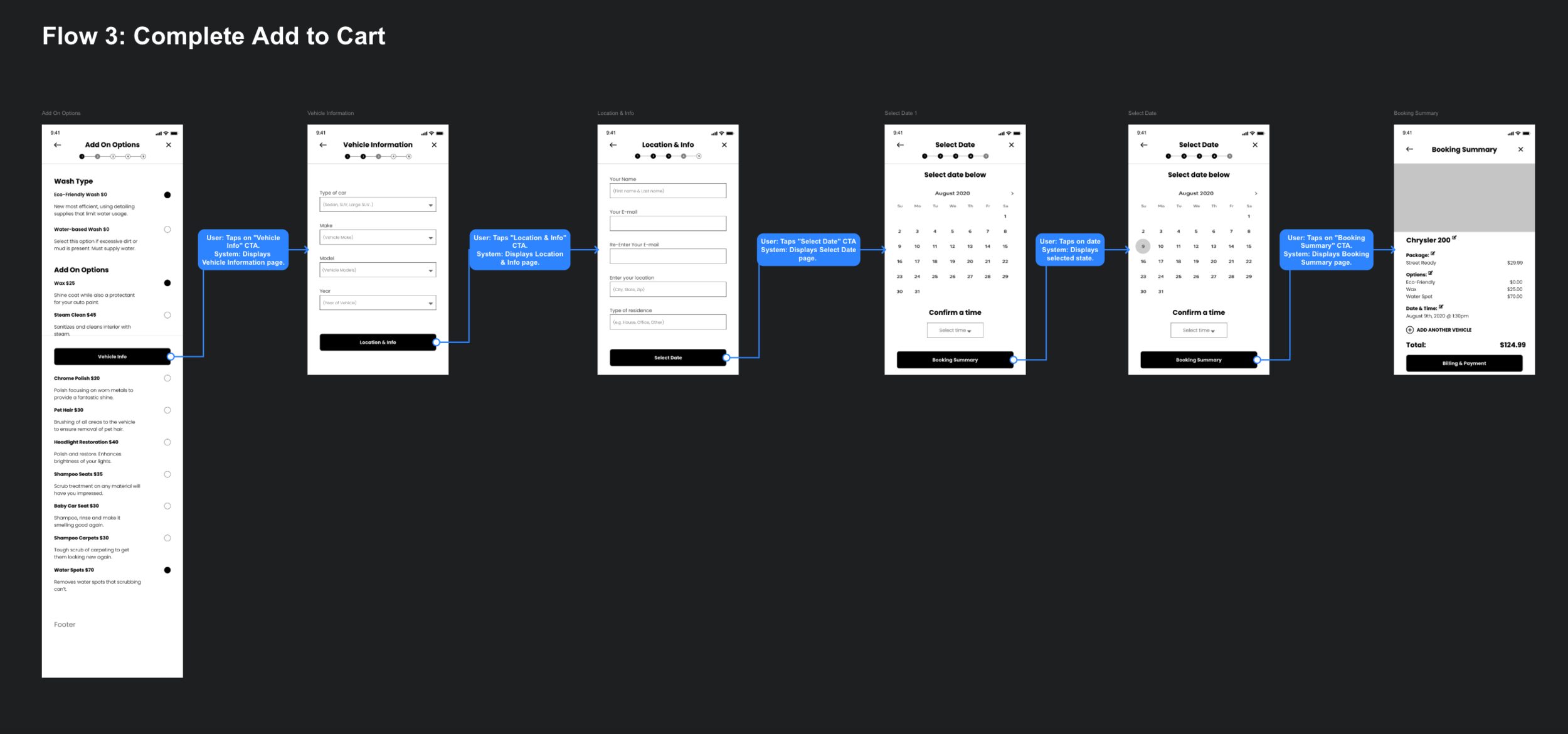 One of the most important parts of an e-commerce platform is to drive our users down the funnel smoothly during checkout. I drafted a step by step flow with pen and paper to show how users would purchase a car wash. It shows what the system displays after a user performs a certain task.