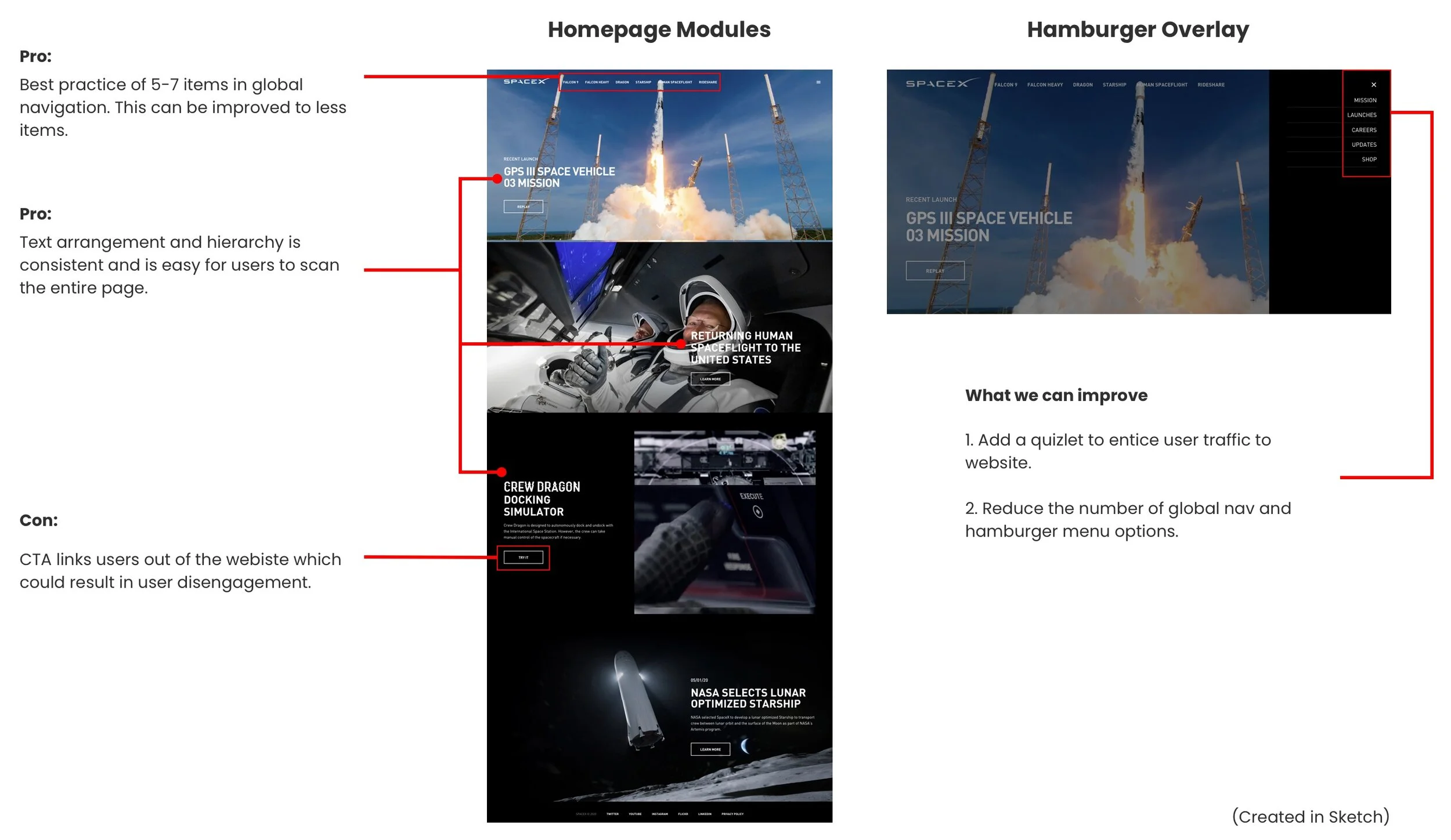 The overall layout of SpaceX works well but testing new global navigation and hamburger menu options could ease user frustration.