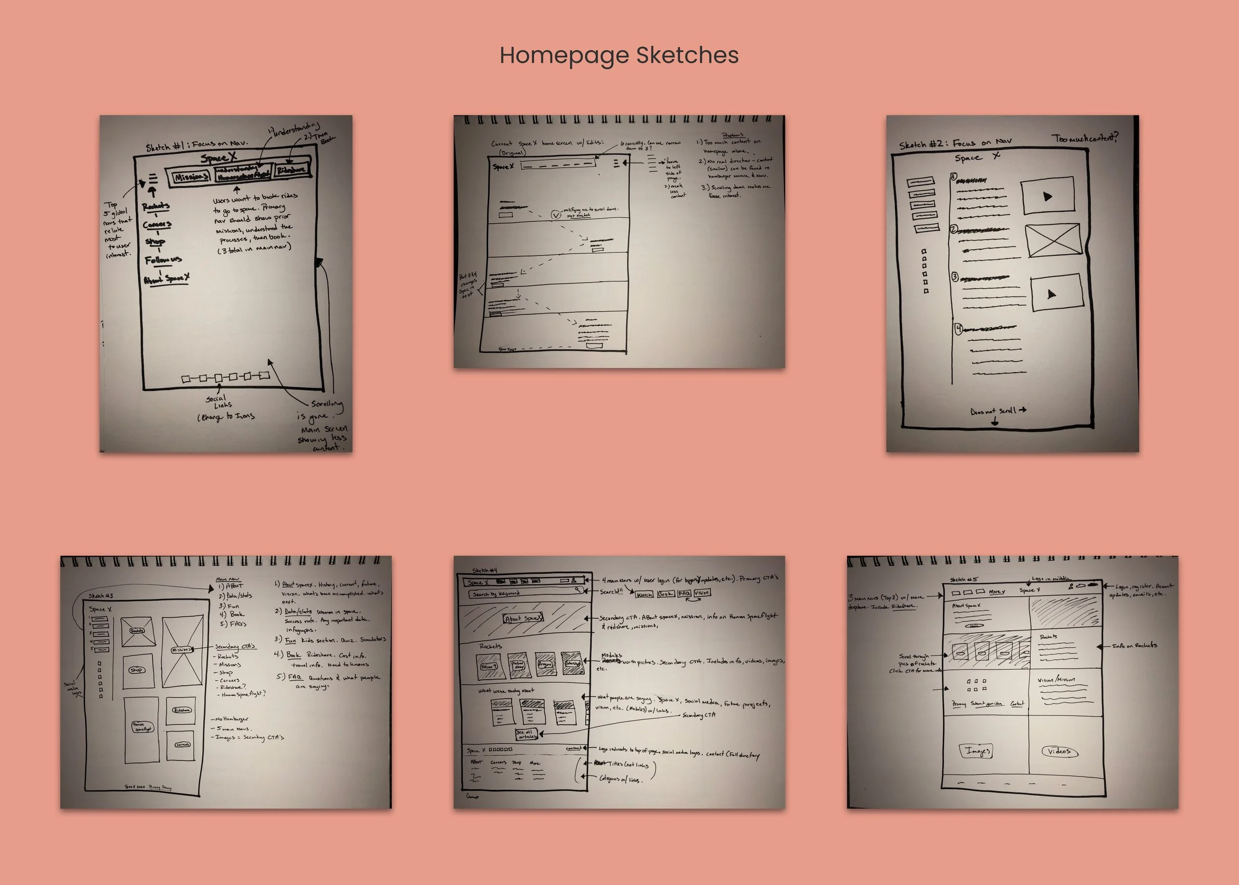 I start by understanding the users and SpaceX needs. I find inspiration for different tasks and conduct desk research by searching, absorbing and listening to what the world is saying. This involves social listening, finding web data and auditing other sites for good and bad examples in order to begin identifying problems.