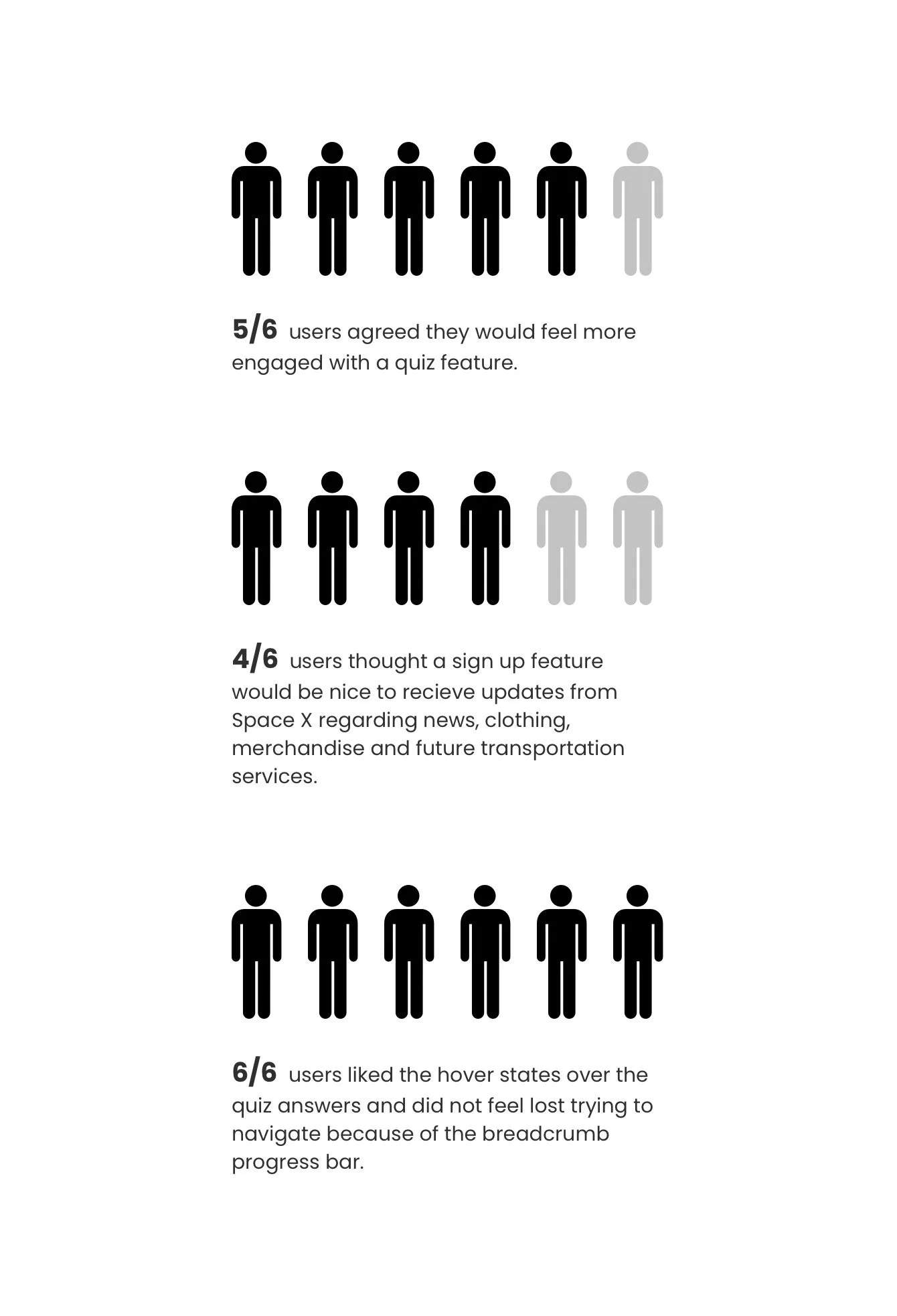 Space travel for the general population isn’t realistic yet and rideshare isn’t clearly understood on the site. Expanding ways to attract users to the SpaceX website in other ways, such as offering a fun and interactive quiz, will increase user engagement.